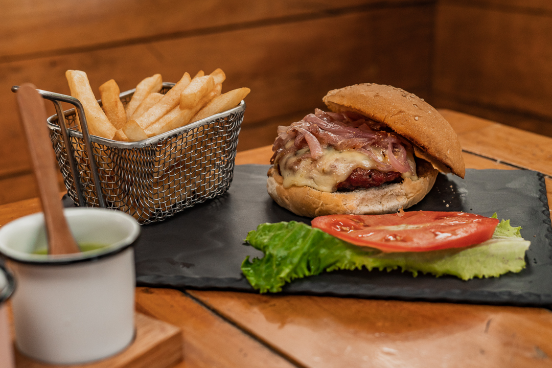 De Sirloin, asada al carbón, con queso, cebolla caramelizada y papas a la francesa o ensalada. Guacamole + $10.