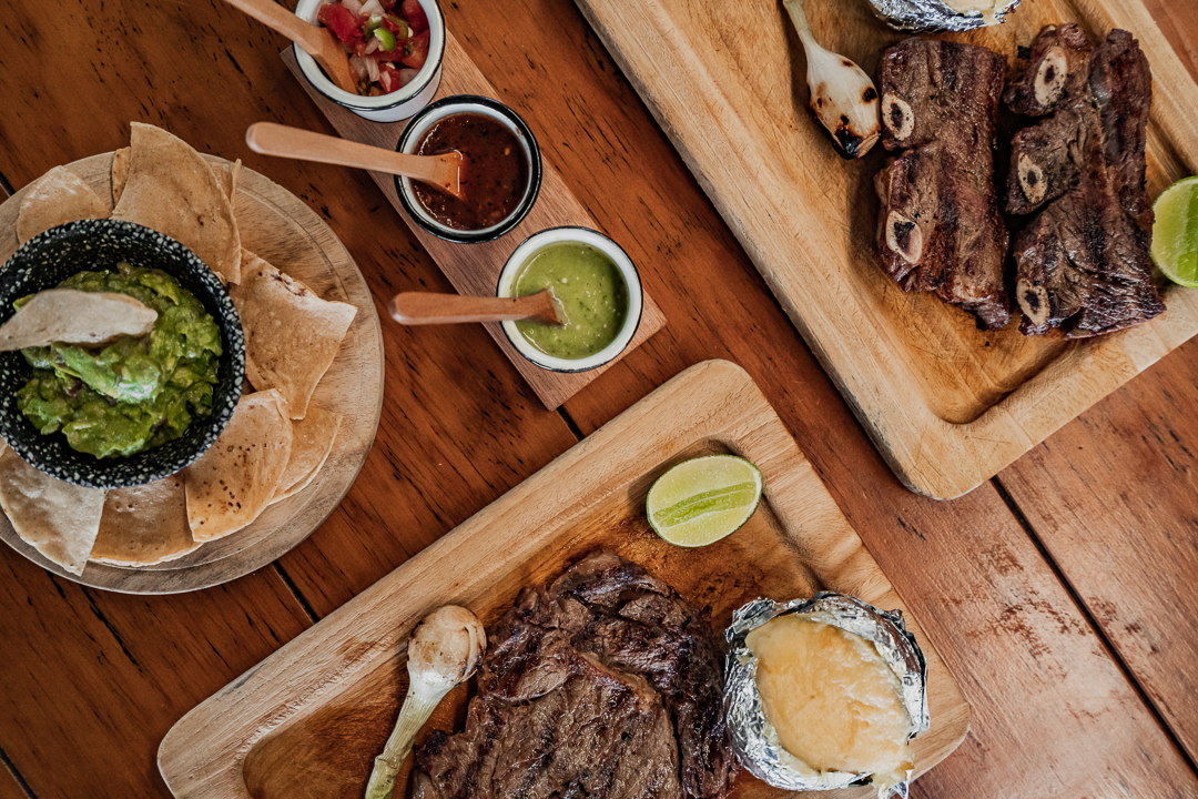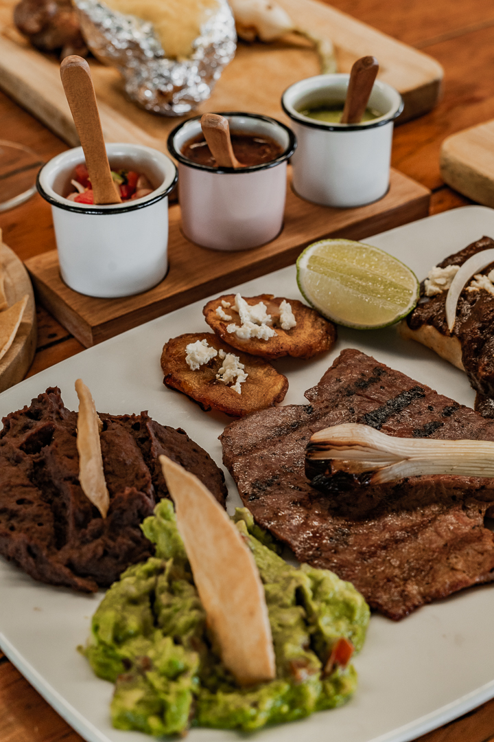 180 gr de filete asado al carbón con dos enmoladas de pollo, frijoles y guacamole.